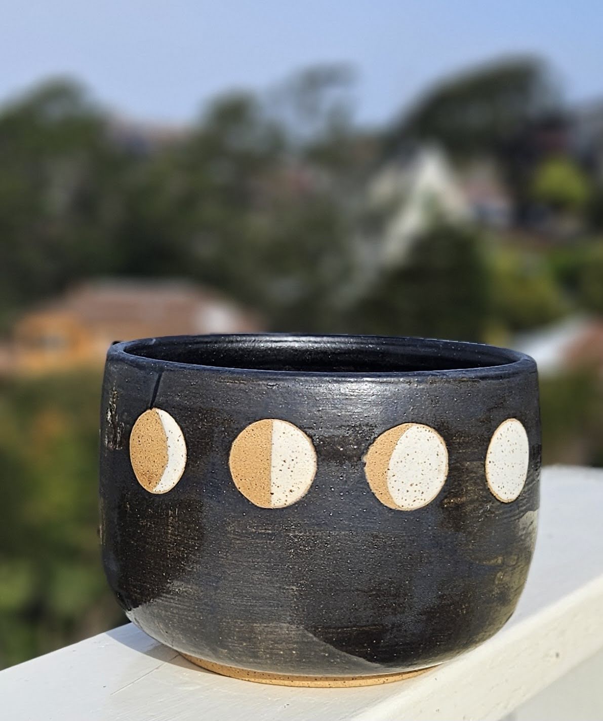 A black matte planter with subtle shiny specks and four phases of the moon (waxing crescent, first quarter, waxing gibbous, full) in white over a speckled buff clay body.